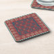 Ein Set aus sechs eleganten, quadratischen, korkgedeckten Untersetzer, mit einem formalisierten Blumenmuster in Beige und Dunkelblau auf einem reich burgundischen Hintergrund.