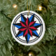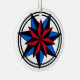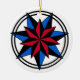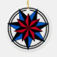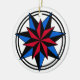 Round white ornament with seven pointed stars in red, blue and black.