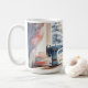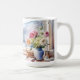 Sewing themed coffee mug. Sewing machine on a table with a pretty landscape in the baground