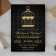 Éblouissez vos invités avec cette élégante invitation de mariage avec une belle volière dorée contre un arrière - plan noir damassé. Ajoutez simplement les détails de votre événement sur ce modèle facile à utiliser pour en faire une invitation unique. Retournez la carte pour révéler une fausse texture de parties scintillant d'or au dos de la carte.
