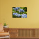 Schöne blaue Hydrangeas tanzen inmitten ihrer grünen Blätter. Ein großartiges Blumenposter oder Druck für die Zuhause oder das Büro.