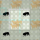 Eine Schwarz-Schatten-Silhouette einer Border Collie arbeitet eine Gruppe von vier Schafen in brauner Silhouette. Der Hintergrund ist Cedabb Olive Green.