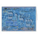 Der traditionelle Passahfestgruß, "Shalom Pesach", wird in den hebräischen Buchstaben mit dekorativem Schnörkel auf einem strukturierten Hintergrund, hauptsächlich in den Schatten des Blaus gezeigt