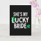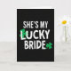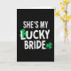 Diese Karte zeigt einen tiefschwarzen Hintergrund mit dem zentrierten Satz „SHE'S MY LUCKY BRIDE“ in drei übereinanderliegenden Zeilen aus strukturiertem Weiß, was den Buchstaben ein leicht verwittertes Aussehen verleiht. Die Wörter stehen eng beieinander wie eine selbstbewusste Ankündigung, und das Layout wirkt intim, als ob jemand stolz seine Lieblingsperson für sich beansprucht. Ein leuchtendes Smaragd-Kleeblatt ersetzt das „U“ in „LUCKY“, wobei die drei herzförmigen Blätter die Kurve bilden und einen romantischen Wink geben 💚. Ein weiteres, kleineres Kleeblatt erscheint als akkurate Verzierung direkt nach „BRIDE“, wie ein kleiner Schwung am Ende eines Toasts ☘️. Der starke Kontrast zwischen dem schwarzen Feld und dem weißen Text macht die Nachricht aus der Entfernung leicht lesbar, während die grünen Details den Blick zurückziehen für einen genaueren Blick. Die weiße Schrift bleibt über alle drei Zeilen hinweg konsistent, wobei die Kleeblätter die einzige Farbe liefern, sodass das Design fokussiert und liebevoll wirkt, ohne dass zusätzliche Bilder benötigt werden. Zentriert auf der Karte platzieren die Zeilenumbrüche „S
