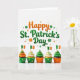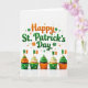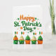 This card opens on a white background with “Happy St. Patrick’s Day” placed across the top in a fun lettered style, alternating green and orange, with small shamrocks and starburst shapes sprinkled around it ☘️. Below the headline, five cupcakes sit in a neat row like friends lined up for a photo, close enough to feel connected without crowding each other 💚. The frosting rises in swirls of green, orange, and creamy white, and the scattered sprinkles add tiny points of color and shine. Each cupcake is topped with a small Irish flag pick that tilts slightly, giving the row a gentle rhythm from left to right. The wrappers vary between green with white shamrock patterns and solid orange, creating an easy back-and-forth color balance. A soft reflective sheen appears under the cupcakes, as if they’re resting on a glossy surface. Small green and orange decorative bursts float near the top text, while the cupcakes remain centered along the lower half of the design.