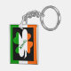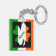 Cette porte - clé présente les rayures traditionnelles vertes, blanches et oranges du drapeau irlandais, qui occupent une forme shamrock traditionnelle. La shamrock est encadrée de noir dramatique et bordée de rayures de drapeau irlandais. Le dos du porte - clé a la même image avec votre texte personnalisé en vert au milieu.