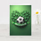 This card features a black-and-white soccer ball centered inside a heart made from many plump three-leaf shamrocks in layered shades of green, set against a deep emerald background that darkens toward the edges. The shamrocks overlap like a close-knit crowd, giving the heart a cozy, affectionate look that suggests friendship shared over a favorite match 💚. Beneath the ball, a draped green ribbon banner curves across the lower portion, adding a gentle sense of movement. The words “Happy St. Patrick’s Day” sit on the ribbon in white lettering, standing out clearly against the green. Soft lighting adds small highlights along the ribbon folds and the ball’s panels, while faint shadows tuck between the shamrocks for extra depth. The mix of sporty energy and Irish tradition feels like two people leaning into the same celebration, side by side ☘️. The heart of shamrocks frames the ball tightly, with the ribbon arcing just below and the darkest green shading pooling in the corners.