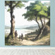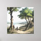Three travelers gaze upon a tranquil lake nestled between distant mountains, shaded by ancient trees. Rendered in colored engraving style, the artwork evokes nostalgia, human connection, and inner journey. Classic aesthetics with contemporary soul—perfect for sustainable tourism, education, cultural heritage, or mindful wellness brands.