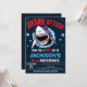 Make a splash with this exciting shark attack birthday invitation! Features fierce shark illustration on navy blue ocean background with bubbles. Perfect for shark-themed birthday parties, pool party, ocean adventures, and boys celebrations. Bold red and blue design creates excitement for your little one's special day. Great for underwater themed parties and shark-loving kids!
