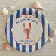 Give your bridal shower a nautical touch with these personalized paper plates. All the text is ready for your custom touch including the slogan at the top, the event name and the date. They feature my realistic style hand drawn illustration of a lobster in red with your text in blue. The text and graphic are set inside a hand drawn scalloped frame with a ribbon look and a bow at the top set against a blue and white nautical striped background.