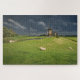 Photo jigsaw puzzle of some sheep in the green grass in front of three windmills under a dark sky with rain clouds just before a spring storm in a landscape in Leidschendam, the Netherlands.