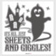 A cheeky Halloween graphic featuring a smiling ghost, crooked haunted house, and the pun-filled phrase “It’s all just sheets and giggles.” Surrounded by stars and spooky charm, this monochrome design blends humor with haunted whimsy—perfect for festive collections, lighthearted themes, and playful takes on October’s ghostly delights.