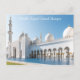 Postkarte mit einem Foto der prächtigen Sheikh Zayed Grand Moschee in Abu Dhabi, Vereinigte Arabische Emirate, mit weißer moderner Architektur im Kontrast zu einem klaren blauen Himmel.