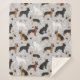 Niedliche Deutsche Schäferhunde in Schwarz und Bräune, Schwarz und Rot, Schwarz und Silber, Weiß und Rücken mit verstreuten Hundeknochen und Pfotendrucken auf hellgrauem Hintergrund.