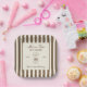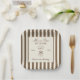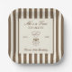 Birthday paper plate featuring a hand-drawn coffee martini glass and coffee beans paired with elegant script and serif fonts in which your personalized information is written. The background is brown stripes on a light background. Check out our store for more items from this collection.