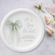 Chic bridal shower paper plates featuring an elegant sage green bow watercolor, "she's tying the knot" showcased in a sage green calligraphy script, and the bride's name and the shower date in simple modern lettering.