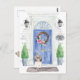 Annoncez votre nouvelle adresse grâce à notre faire-part élégante avec un tzu Shih aux cheveux longs, une porte d'entrée bleue, un tapis de bienvenue, un panneau en ardoise, des topiaires et une couronne fleurie posée sur un arrière - plan en brique grise.