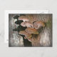 Auf dieser Postkarte befinden sich Shiitake-Pilze, die auf einem Holzgeländer im Wald wachsen.
