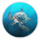 An insanely detailed shimmering turtle on a blue turquoise ocean background.