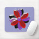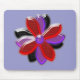 Dieses hübsche Mousepad zeichnet sich durch ein digitales Bild einer zarten Blume mit lila, rot-schwarzen Blütenblättern mit lila Mittelpunkt aus. Die Blätter sehen aus, als wären sie aus glänzendem Kunststoff, der das Licht gefangen hat und einen unglaublichen Effekt verursacht hat. Der Hintergrund ist eine beruhigende blaue Farbe.