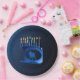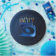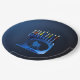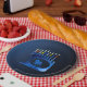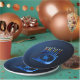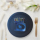 Eine moderne, metallische, blaue Chanukkah-Menorah mit einem Löwen in Silhouette, vor einem dunklen, nachtähnlichen Hintergrund. Alle neun Kerzen sind beleuchtet.