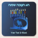 Eine moderne, metallische, blaue Chanukkah-Menorah mit einem Löwen in Silhouette, vor einem dunklen, nachtähnlichen Hintergrund. Alle neun Kerzen sind beleuchtet. Auch der hebräische Text "Chag Chanukkah Sameach" (Happy Hanukkah) erscheint in blau und weiß. Fügen Sie Ihren eigenen zusätzlichen Text hinzu.