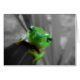 Ein schimmernder grüner Frosch auf einem schwarz-weißen Hintergrund, der die Kamera posiert.