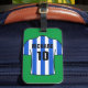 Erstellen Sie ein Gepäckanhänger mit Ihrer Wahl des Football-Shirts mit einem zusätzlichen Namen und einer zusätzlichen Nummer. Fußball-Shirt in Blau und Weiß.