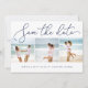Mit diesen modernen und romantischen Terminkarten verkünden Sie Ihre Hochzeit oder Hochzeit in Urlaubsort im schicken Stil. Drei quadratische Fotos sind nebeneinander angeordnet, "Save the Date" überlagert in handgeschriebenen Schriftzeichen. Personalisieren Sie unten mit Ihren Namen, Hochzeitsdatum und Ort. Karten kehren zu einer Aquarellwäsche in lebhaften türkisfarbenen Ozeantönen zurück.