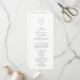 Dieses einfache, moderne, einzigartige Monogramm Hochzeitsprogramm der Shylah Collection ist perfekt für eine klassische Hochzeit. Das schlichte Schwarz-Weiß-Design zeichnet sich durch ein geometrisch ovales Monogramm mit den Initialen des Paares und ein elegantes, aber gleichzeitig boho-Ambiente aus. Geben Sie die Namen des Paares, das Datum und den Ort der Hochzeit, Dankeschön-Nachricht, Dienstorden, Hochzeitsfeier und ein optionales "in Loving Memory"-Denkmal ein.