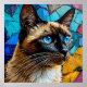 Eine faszinierende künstlerische Darstellung einer siamesischen Katze mit atemberaubenden blauen Augen vor einem dynamischen und farbenprächtigen abstrakten Hintergrund. Ideal für Themen wie Haustiere, Kreativität und künstlerischen Ausdruck.