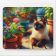 Ein elegantes Ölgemälde mit einer anmutigen siamesischen Katze, in einem lebhaften Garten mit bunten Blume und üppiger Vegetation. Die reichhaltigen Texturen und warmen Farbtöne erwecken die Schönheit und das Poise der Katze und schaffen eine ruhige und faszinierende Szene, die perfekt für Katzenliebhaber und Kunstliebhaber geeignet ist.