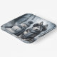 Ein flauschiger sibirischer Husky mit Schal und Ohrmuffen sitzt neben einem fröhlichen Schneemann mit Hut und Schal