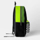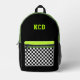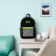 Dieses lustige Kinder-Rucksack-Design verfügt über eine schwarze, weiße, säuregrüne und olivgrüne Farbpalette mit karierten Taschen und Initialen. Es ist ein lustiges, modernes Design für alle Altersgruppen!