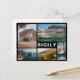 Carte postale d'un collage avec plusieurs photos de plages, temple romain, Scopello, salines et Cefalù sur l'île de Sicile en Italie dans un cadre noir avec le texte : 'Sicile'.