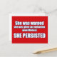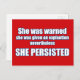 Diese Karte repräsentiert für mich den Power der Weiblichkeit. Die Weigerung, ein gutes Mädchen zu sein, "wurde sie gewarnt", der demoralisierende Versuch, "ihr wurde eine Erklärung gegeben" und die trotzige Kraft, trotz männlichen Widerstandes vorwärts zu treiben, "beharrte sie".