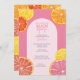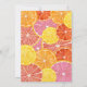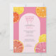 Weiße Zitrusfrüchte in den Farben Rosa, Korallen, Orange und rubinrote Grapefruits. Die handgezeichneten Zitrusscheiben enthalten eine Aquarellfarbe, die eine saftige Ergänzung zu einer farbenfrohen Polterabend-Einladung darstellt.