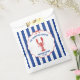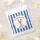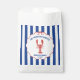 Geben Sie Ihrer Bridal-Shower eine maritime Note mit diesen personalisierten Papier-Tüten. Der gesamte Text ist für Ihre individuelle Gestaltung vorbereitet, einschließlich des Slogans oben, des Veranstaltungsnamens und des Datums. Sie zeigen meine realistische, handgezeichnete Illustration einer roten Languste mit Ihrem Text in Blau. Der Text und die Grafik sind in einem handgezeichneten, gewellten Rahmen mit einem Band-Look und einer Schleife oben auf einem blau-weiß gestreiften, maritimen Hintergrund gesetzt.