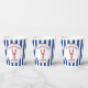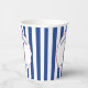 Geben Sie Ihrer Bridal Shower mit diesen personalisierten Papiertassen eine maritime Note. Sie zeigen meine handgezeichnete, realistische Illustration einer roten Languste mit Ihrem individuellen Text in Blau. Der gesamte Text ist für Ihre persönliche Note vorbereitet, einschließlich des Slogans "Sie hat ihren Hummer gefunden" oben. Der Text und das Grafikdesign sind in einem runden, gewellten Rahmen mit einem Bandlook und einer roten Schleife oben angeordnet, der vor einem blau-weiß gestreiften Hintergrund steht. Das Text- und Grafikdesign erscheint auf beiden Seiten des Bechers.