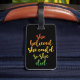 Dieses Gepäckanhänger-Design enthält das Zitat "She glaubved she can So She did" in rot, gelb und grün auf schwarzem Hintergrund.