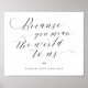 Einfache Elegante Kalligrafie Script Alternative Gästebuch Weil Sie uns die Welt gemein haben, unterschreiben Sie bitte unsere Karte - Gästebuchabonnement in wunderschönen, fließenden extravaganten Buchstaben und Ihrem personalisierten Text. Stilvolles, aber einfaches formales Design in Schwarz/Weiß oder jeder beliebigen Hintergrundfarbe. Klicken Sie einfach auf den Link, um den Text anzupassen, der unter dem Bereich für die Textpersonalisierung rechts angezeigt wird, und wählen Sie Ihren eigenen Farbhintergrund aus. Dieses Schild Poster-Template macht es einfach und schnell, atemberaubende Ergänzungen Ihrer Hochzeitsdekoration zu schaffen. Die Zeichen können vergrößert werden, es gibt viele Größen zur Auswahl, sowie Optionen für die individuelle Gestaltung und Bearbeitung. ~ Karo mein Geschäft oder Sammlung unten für weitere ergänzende Zeichen für Ihre Hochzeit