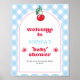 Herzlich willkommen bei Ihren Party-Gästen mit diesem süßen "Cherry on Top" Babyduschplakat! Mit einem skurrilen Kirschmotiv, einer Retro-inspirierten Typografie und einer weichen, blauen Gingham-Grenze ist dieses köstliche Plakat ein Set für einen herzlichen Empfang.