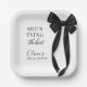 Party-Teller aus Papier, entworfen mit einem klassischen schwarzen Schleifenmotiv und dem Satz sie knüpft den Knoten. Entworfen für eine saubere, elegante Tischdekoration, die gut zu schwarzer und weißer Hochzeitsdeko passt. Geeignet für Brautduschen, Verlobungsfeiern, Junggesellinnenabschiede und Hochzeitsfeiern. Vollständig anpassbarer Text mit einem druckfertigen Design für Partytischwäsche.