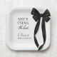 Party-Teller, die mit einem klassischen schwarzen Bogen-Motiv und dem Satz sie knüpft den Knoten gestaltet sind. Entworfen für eine saubere, elegante Tischdekoration, die gut mit schwarzer und weißer Hochzeitsdeko harmoniert. Geeignet für Brautduschen, Verlobungsfeiern, Junggesellinnenabschiede und Hochzeitsfeiern. Vollständig anpassbarer Text mit einem druckfertigen Design für Partytischwäsche.