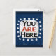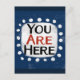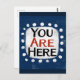 "You Are Here" ist ein niedliches Textdesign in blau mit schwarzem und rotem Text, zusammen mit einer weißen Akzent-Form und weißen texturierten weißen, weißlichen, weißlichen Punkten, die ihn umgeben.