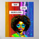 70er farbige Frau mit farbenfroher Afro, cooler Sonnenbrille und groovem Regenbogen-Hintergrund. Im Text steht: "Du bist fabelhaft."