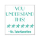 Dieses inspirierende Gummi-Briefmarke-Design beinhaltet die Nachricht "SIE VERSTEHEN DIES!" und einen personalisierten Pädagogen-Namen. Es hat auch eine dekorative Sternform. Es könnte von einem Lehrer oder Erzieher bei der Bewertung der Arbeit eines Schülers genutzt werden, um anzuerkennen, dass ein Schüler eine außergewöhnliche Arbeit geleistet hat.