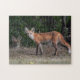Ein verstohlener, roter Fuchs am Waldrand behalte ein Auge auf ein Geschwister.
