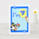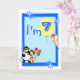 Ich bin 7 Geburtstagskarte mit lustigem Clown, Pinguin und Eis und Ballons auf blauem Hintergrund. Personalisieren Sie dieses Design einfach, indem Sie den Text hinzufügen oder ändern.