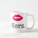 Une tasse de café drôle comportant le mot "sien" dans un ensemble de lèvres roses lumineuses au-dessus de lui.